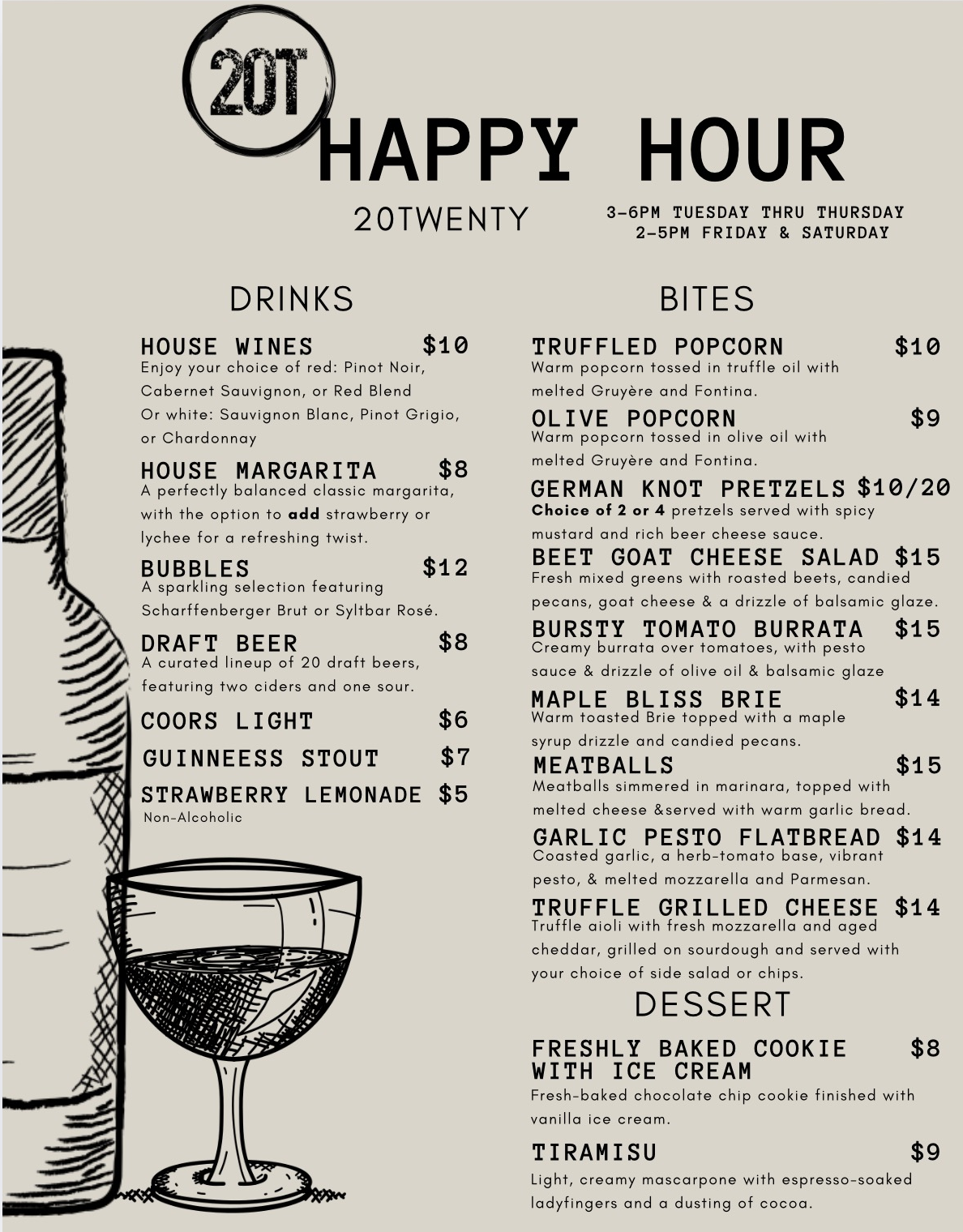 - 20 Wines on Draft: Explore our curated wine selection featuring small producers and distinctive varieties