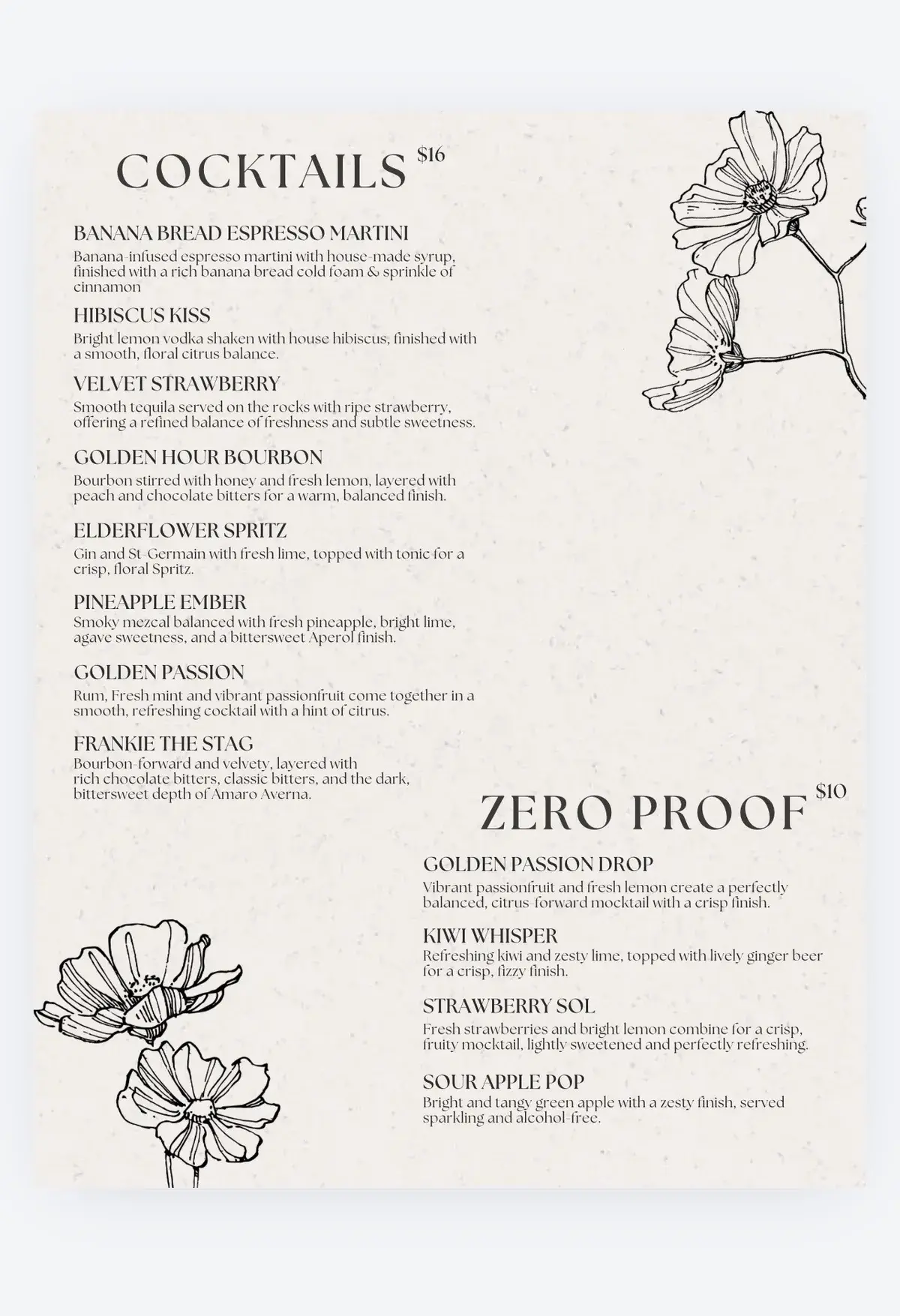 Made to order with seasonal ingredients, fresh-squeezed juices, and premium spirits.